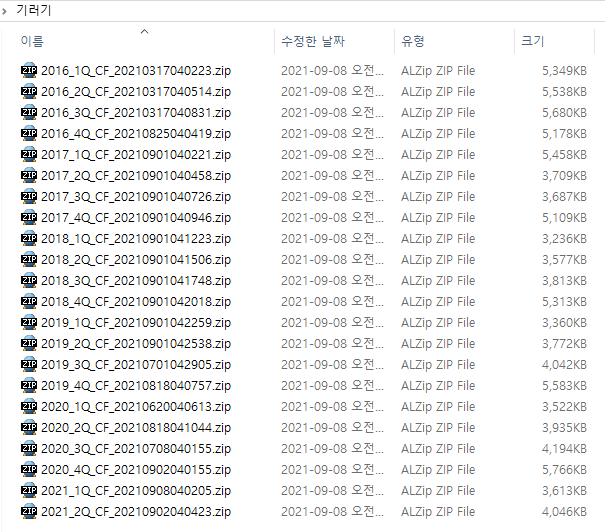 2021년도부터 2016년도까지 탭을 클릭하면서 모든 현금흐름표를 다운로드하고, 다운로드한 압축파일을 하나의 폴더에 몰아놓는다. 필자는 아래와 같이 기러기라는 폴더에 다 몰아놓았다.