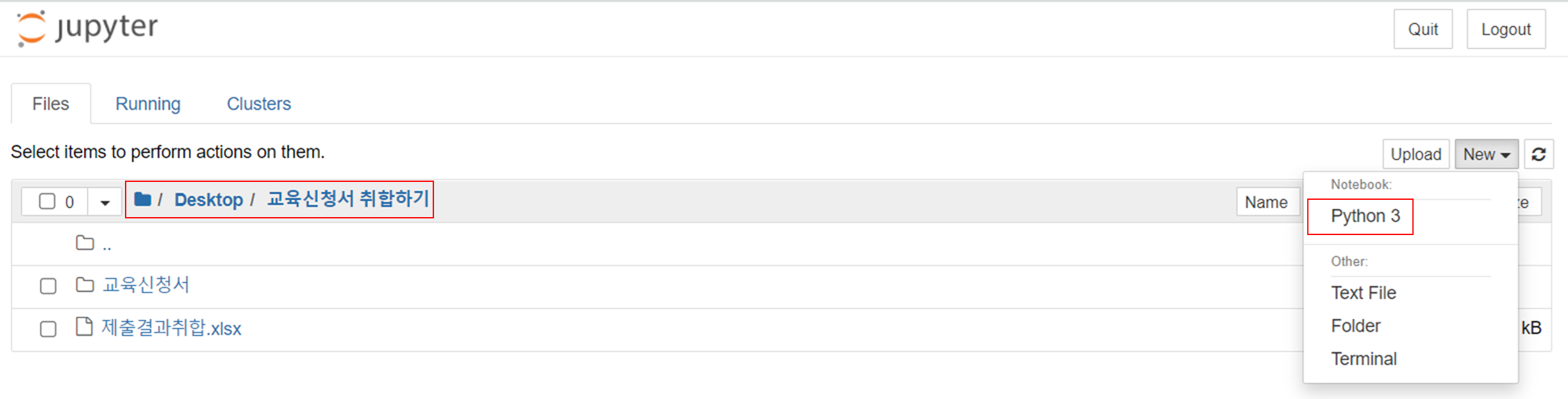 먼저 데이터가 있는 경로("교육신청서 취합하기")에 New > Python 3를 클릭하여 ipynb 파일을 생성합니다.