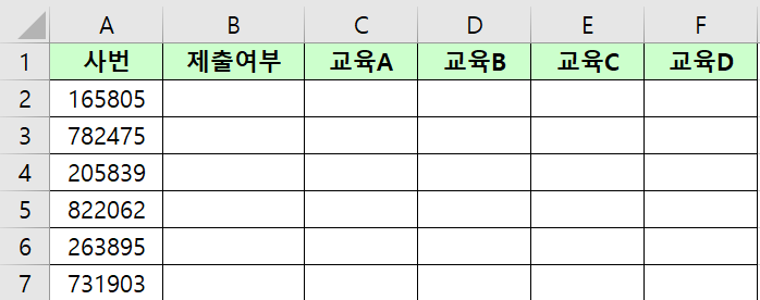 그런데 1천명의 직원 가운데 대부분이 아직 신청서를 제출하지 않았습니다. 그래서 제출한 신청서를 바탕으로 제출한 직원이 듣고 싶은 교육을 취합하고 제출하지 않은 직원을 체크하려 합니다. 여기에 사용하는 양식은 아래와 같습니다.