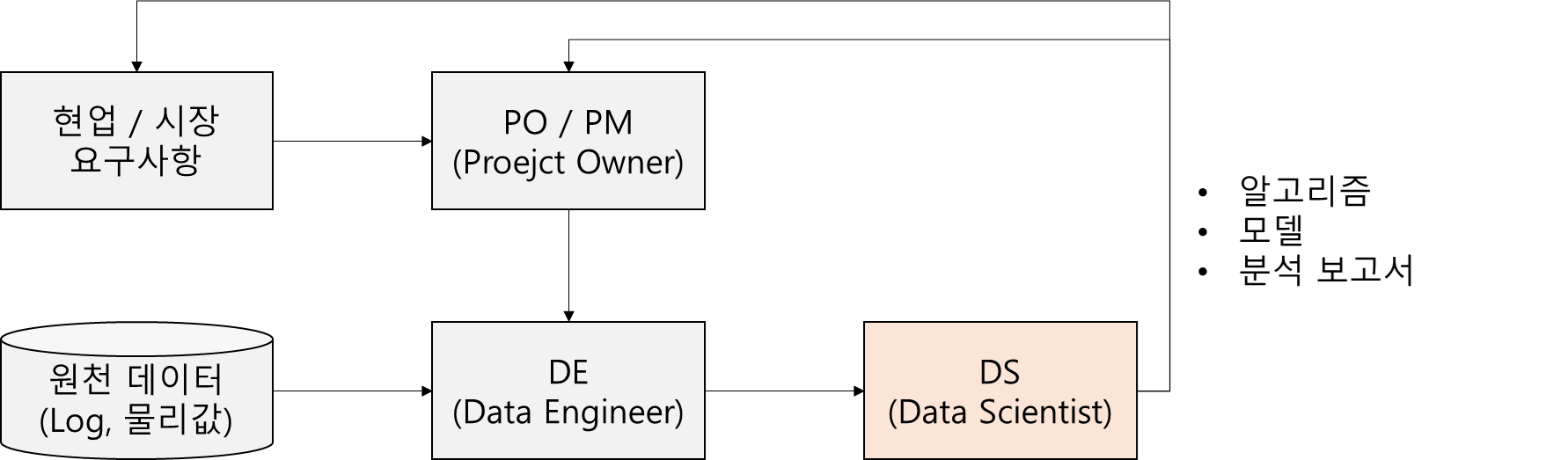 데이터 사이언티스트는 아래와 같이 현업, PO/PM, DE와 같이 일을 합니다.